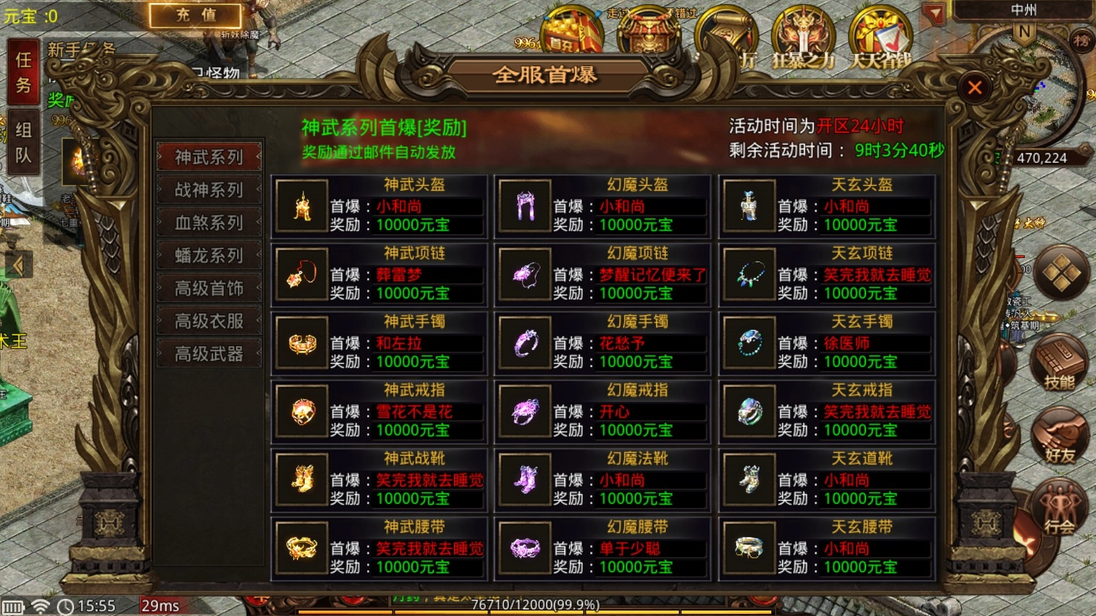 全服首爆福利来袭!神武、战神、血煞等系列装备都设有丰厚的首爆奖励,海量元宝静待领取,只要爆出就能轻松赚得盆满钵满!