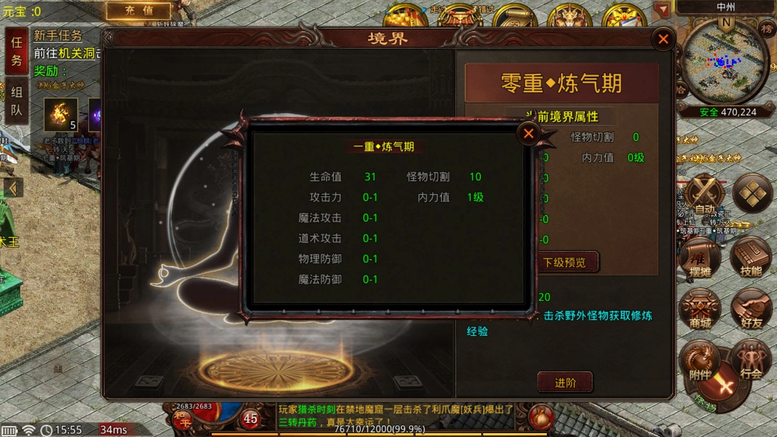 境界:在野外击杀怪物就能获得修炼经验,经验值累积满后会自动进阶,每提升一重境界都能增加攻魔道属性,还会提供切割伤害等属性加成。