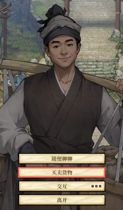 触发交互的方式为:点击货郎身旁的对话图标,待弹出菜单后,从中选择“买卖货物”这一选项。