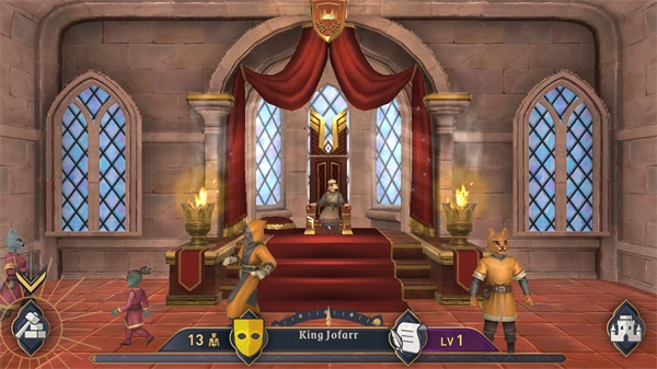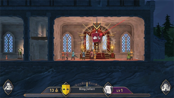 进入城堡场景界面后,点击带有皇冠标识的卡牌,完成KingJofarr的加冕流程,以此推动游戏中与王权相关的进程。