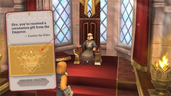 在对话界面里,找到CassiustheElder的提示信息,点击对应的加冕礼物图标,就能领取相应奖励以推进流程。