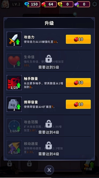 合理地提升自身能力,像触手数量、移动速度、攻击力这类都可以进行升级,而且随着等级的提高,还会解锁更多新的能力。
