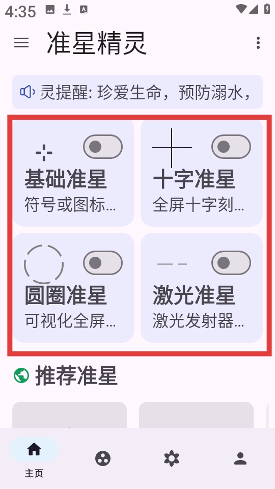 成功进入首页后,我们能看到基础准星、十字准星、圆圈准星等多种类型。