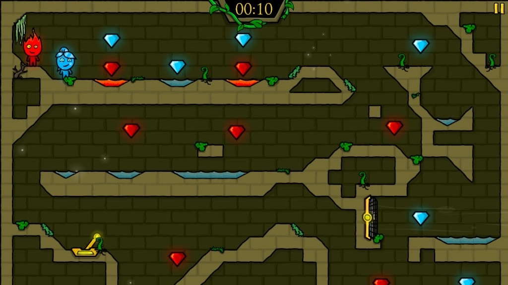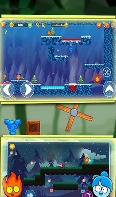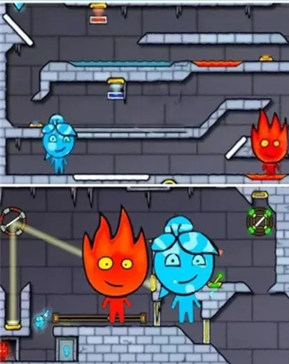 化身为水火精灵,一同协作机关,相互配合闯过重重难关,获取地图中的宝石,最终找到殿堂的出口。