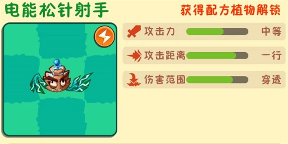 电能松针射手:由松针射手与脉冲黄桃合成可得,其发射的子弹能够穿透所在行的全部僵尸。