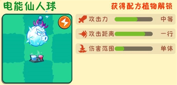 电能仙人球:由仙人球与脉冲黄桃合成而来,它能够对空中的小型机械僵尸施加短暂的麻痹效果。