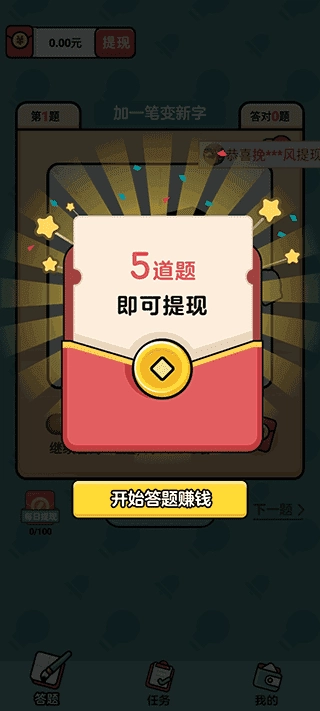 这是一款休闲益智类的汉字游戏,玩家在游戏里能够闯过一关又一关的汉字关卡,进而获得红包奖励。