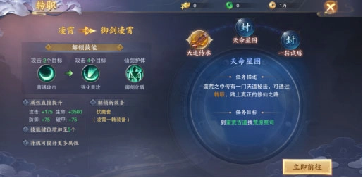 当御剑凌霄的等级提升至220级时,二转任务就会解锁。该任务分为三个阶段,按照任务指引完成全部阶段的挑战后,就能顺利完成转职。
