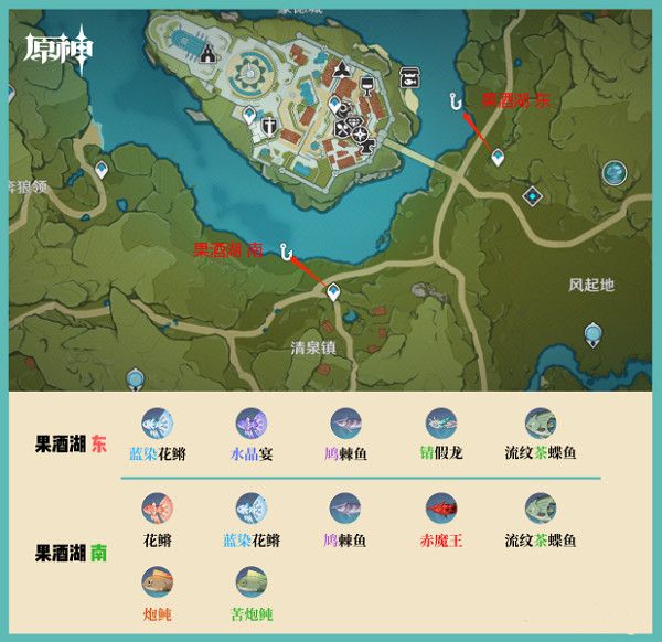 果酒湖南面水域中生活着这些鱼类:花鱂、蓝染花鱂、鸠棘鱼、赤魔王、流纹茶蝶鱼、炮鲀以及苦炮鲀。(具体的钓鱼位置可参照下图)