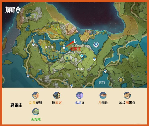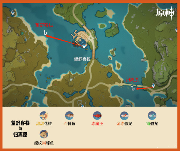 璃月境内分布着七处钓鱼地点,它们依次为:轻策庄、望舒客栈、归离原、奥藏山、琥牢山、渌华池与天遒谷。