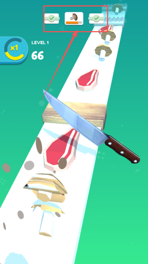 3、完成切菜任务:进入LEVEL1 ×1 66界面后,持续进行切菜操作,直到界面上的数字变为零即可。