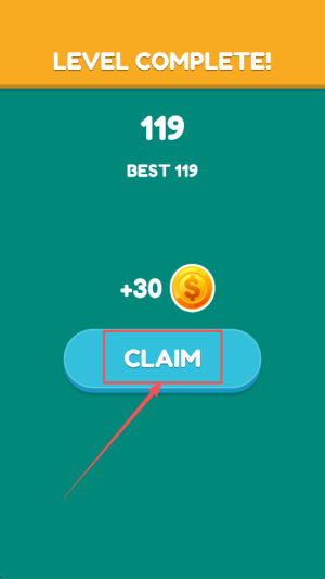 4、领取奖励:当界面显示“LEVEL COMPLETE! 119 BEST119 +30”时,点击“CLAIM”按钮即可领取奖励。
