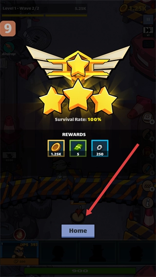 4、战斗结束后点击Home按钮,回到主界面领取通关奖励。