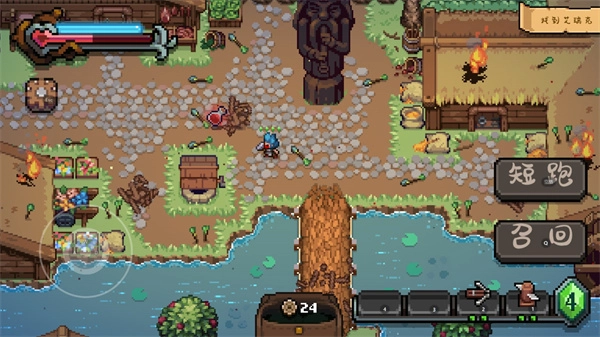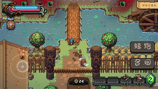 战匠杜沃属于像素风格的塔防游戏,操作方式为左侧控制上下左右移动,右侧设有冲刺和召回两个功能键。目前游戏内已推出的防御建筑共有三种:其一为近战类型的旋风刀,其二是远程攻击的箭塔,最后一种则是具备减速效果的焦油地。