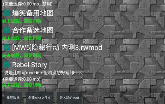 2、第二种方法,压缩包类型的,解压到以下路径/storage/emulated/0/rustedWarfare/units/。没找到文件夹的可以点击创建MOD文件夹。解压后到MOD文件夹后,在游戏里点击主界面的模组按钮,进入MOD加载界面。勾选你想要使用的MOD,然后点击重载数据,然后点击保存。如果MOD内代码有错误,在相应MOD名称下会有红色文字报错。