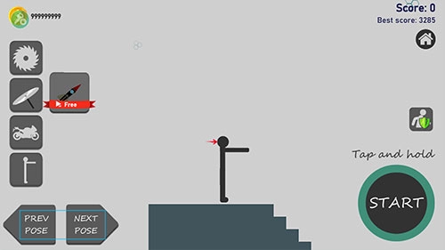 2、玩家的目标是让火柴人尽可能严重地摔倒,可通过点击左右按键来控制火柴人切换姿势,长按start键开始,松开后火柴人便会跳出。