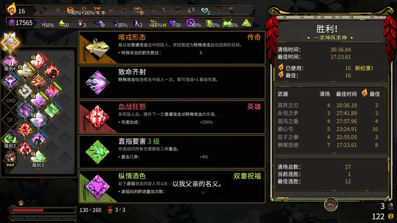 主要是“火焰战车卸任”,这只在第三层至福乐土出现。效果是之后关卡不会出现火焰战车。由于这个物品刷新的概率特别低,如果专门刷取的话,建议带黑夜之镜最后一行的背面天赋,刷新卡戎井的内容。也可以尝试把井里面的东西都买了,说不定刷新的概率会高一点?