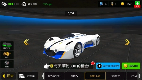 车库里停着许多汽车,只要完成任务就能解锁心仪的新车。