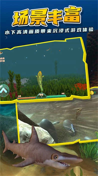 在这款游戏中,采用了三维立体的视觉呈现方式,延续了经典的弱肉强食玩法,使玩家能够沉浸式地感受在海洋世界中捕食鱼类、逐步通关的乐趣。