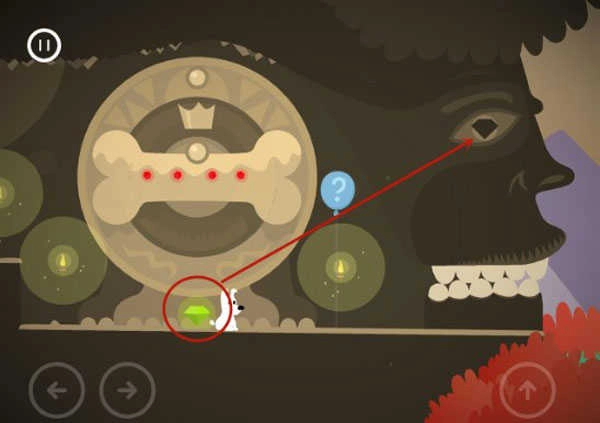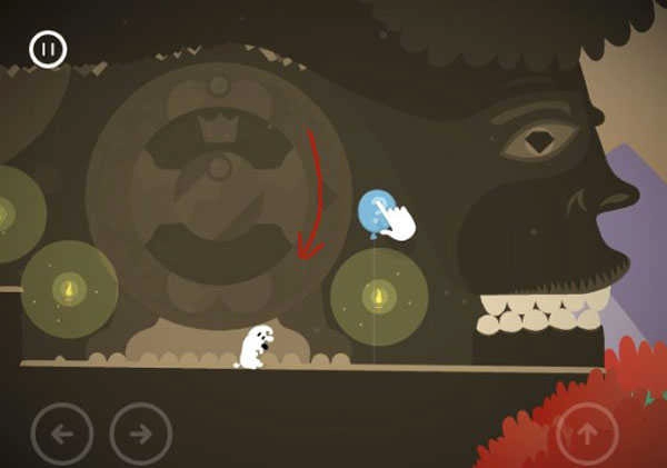 第一章里有个难度偏高的关卡,解题关键是调整石盘的角度,让它们拼合成骨头的轮廓。完成这一步后,会有颗绿色钻石掉落,把它嵌入巨人的眼窝,巨人的嘴巴就会开启,米皮就能顺利通过了。