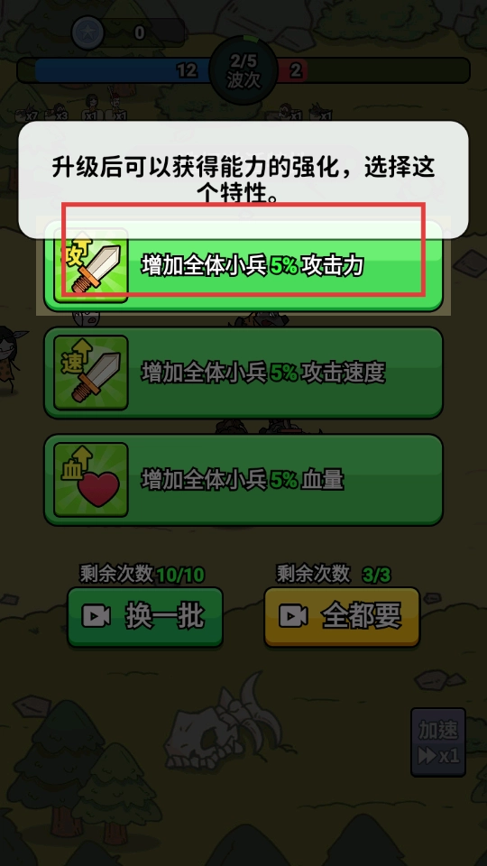 选择【增加全体小兵5%攻击力】这一特性,以此强化小兵的作战能力,进而提升整体战斗效率。