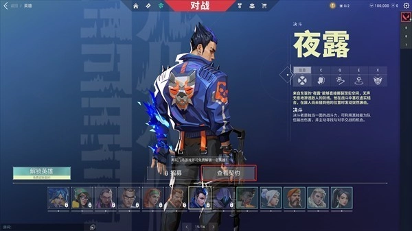 2、在该界面处,选择您想要解锁的英雄,点击查看契约,进入英雄契约界面。