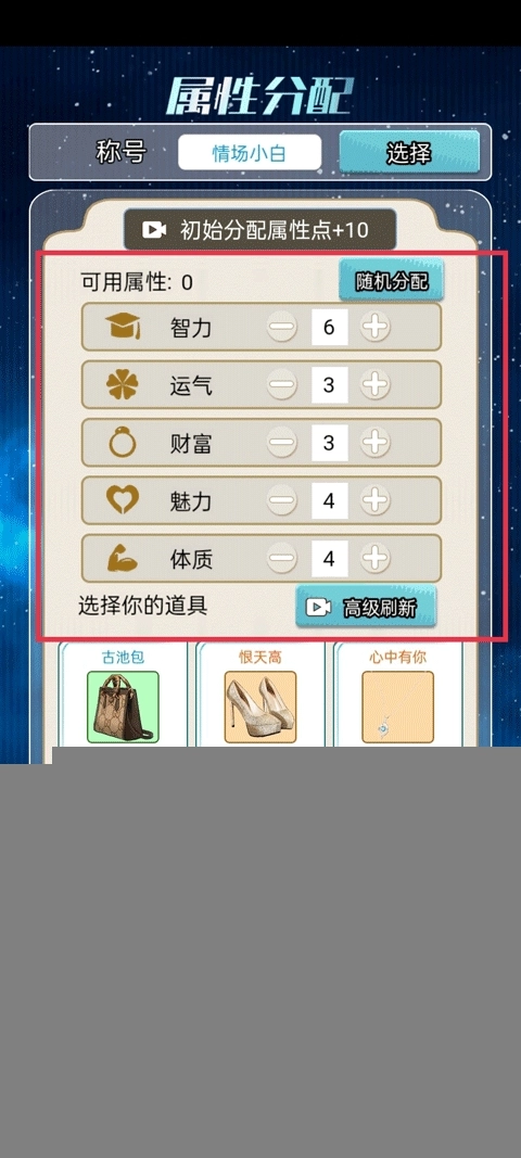 3、属性分配初始值是10个点,根据自己的需求来添加智力、运气、财富等,然后选择的加持道具进入转生。