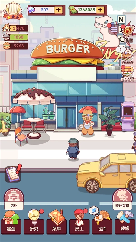 玩家可以自由定制店铺的外观风格:刚开始能给餐车换不同的涂装,到了后面还能自己选择店内墙面的颜色、搭配桌椅的样式,甚至可以摆放绿植、挂起写着特色菜品的黑板,打造出复古夜市、像素游戏厅等各种主题的网红打卡点。等单店的盈利情况稳定了,玩家就能开始扩张事业——不仅能把店面扩大来接待更多顾客,还能在城市的不同区域开分店,并且根据当地的消费能力调整经营方式,比如在高端商圈推出精致的套餐,在学校附近主打性价比高的产品,一步步建立起自己的餐饮连锁王国。 游戏里设置了很多随机挑战来增加趣味性,像节日期间的巨型汉堡订单、深夜里的紧急外卖任务等,这些都考验着玩家应对突发状况的运营能力。同时还有竞争对手系统,玩家得及时调整促销策略才能保住市场份额。另外,玩家还可以通过推出亲子套餐、踏青午餐这类组合套餐来提高客单价,参加汉堡制作比赛赢取奖项,积累店铺的好口碑从而登上城市美食排行榜,解锁更多的经营权限。