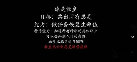 教皇可以清晰知晓全场神职的具体身份,其技能为向其他玩家表明自身教皇身份。开局时建议主动寻找白灵并坦诚告知自己的身份——毕竟白灵是全场实力强劲的神职,能有效保护教皇避免被误刀或强行攻击。不过要注意,不要过于明显地追随某个人,防止身份暴露。一般来说,教皇更适合屠边局,技能冷却时长大概在80到100秒之间。当游戏存在第三方阵营时,如果教皇与狼链产生关联,就会加入第三方阵营,此时教皇不再归属于好人阵营,且在教皇死亡后,只会带走属于自己的第三方阵营成员。