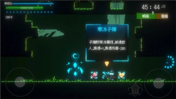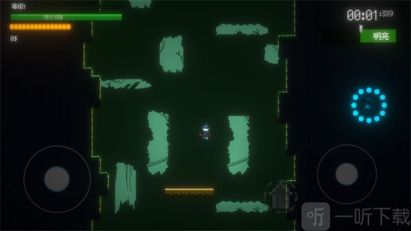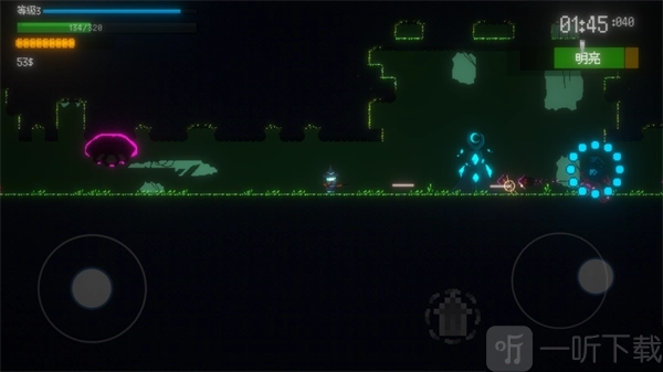 右边的摇杆移动时会触发射击功能,子弹会朝着摇杆移动的方向发射,同时右上角还显示着生存时间和难度提示信息。