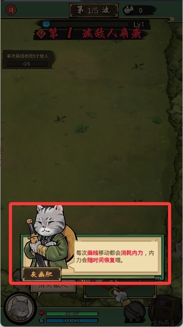 闯荡江湖时,画线为小猫侠指定移动轨迹或技能方向,可快速发动斩击、连环拳与躲闪,每次突破都考验手速与预判。