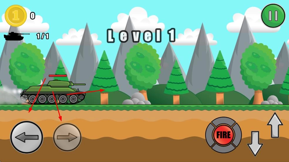 处于Level1关卡,操控绿色坦克,通过左下角左右箭头按钮调整位置,开启战斗进程。