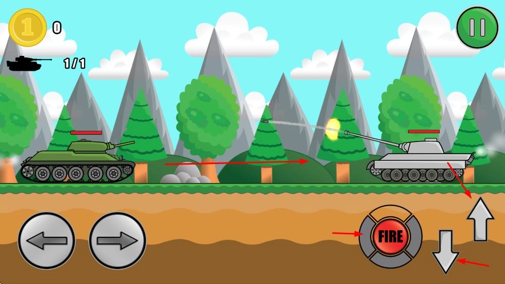 点击右下角红色FIRE按钮发射炮弹,攻击敌方灰色坦克,留意敌方血量变化与自身金币积累。