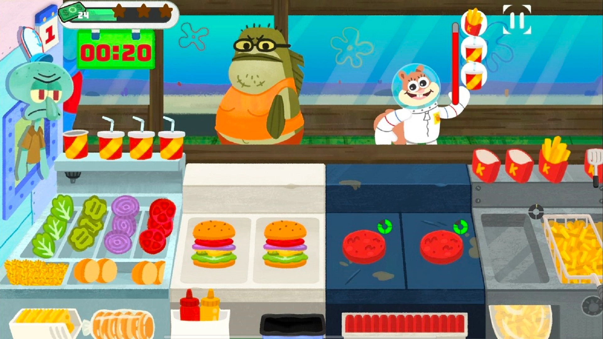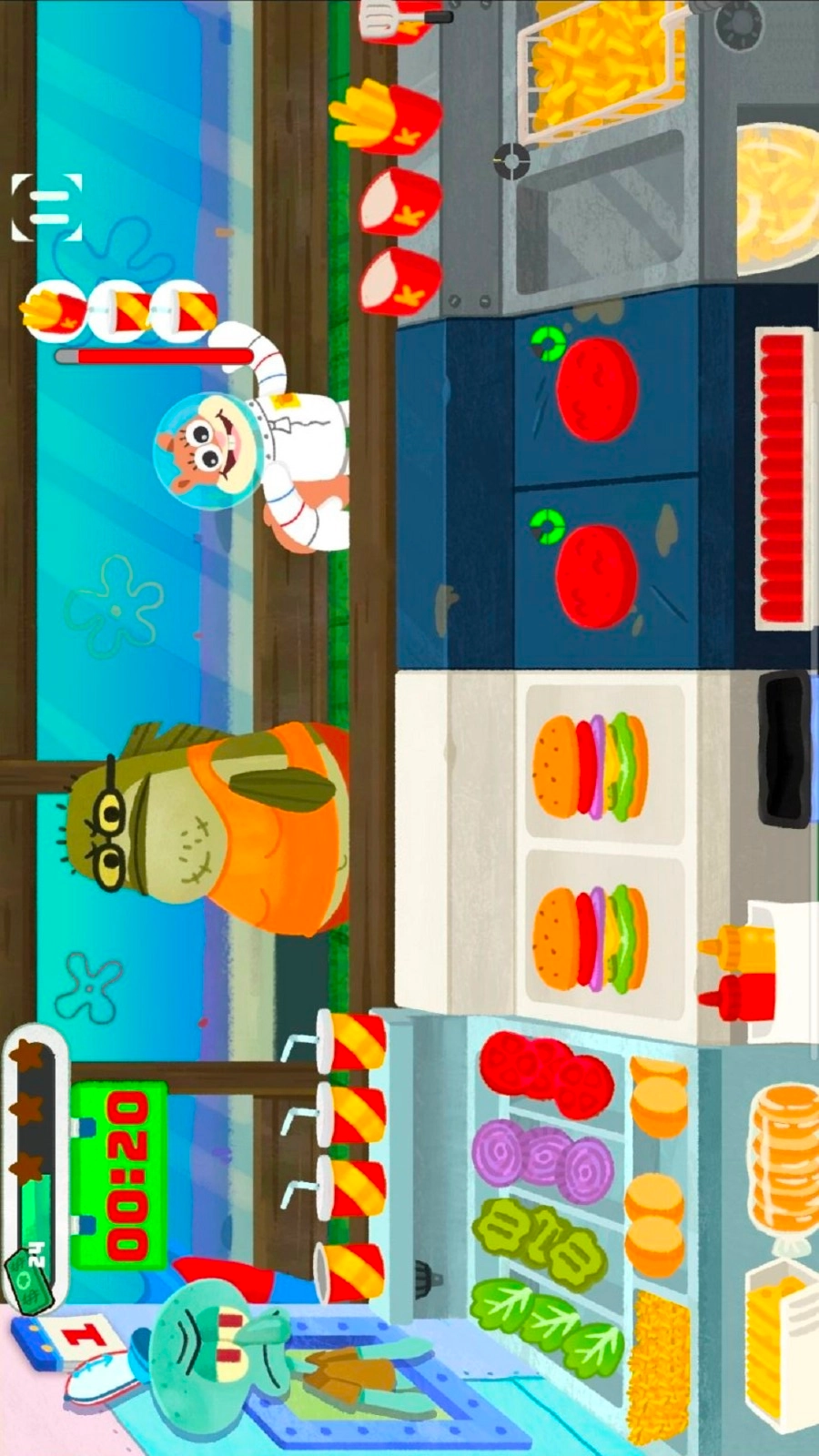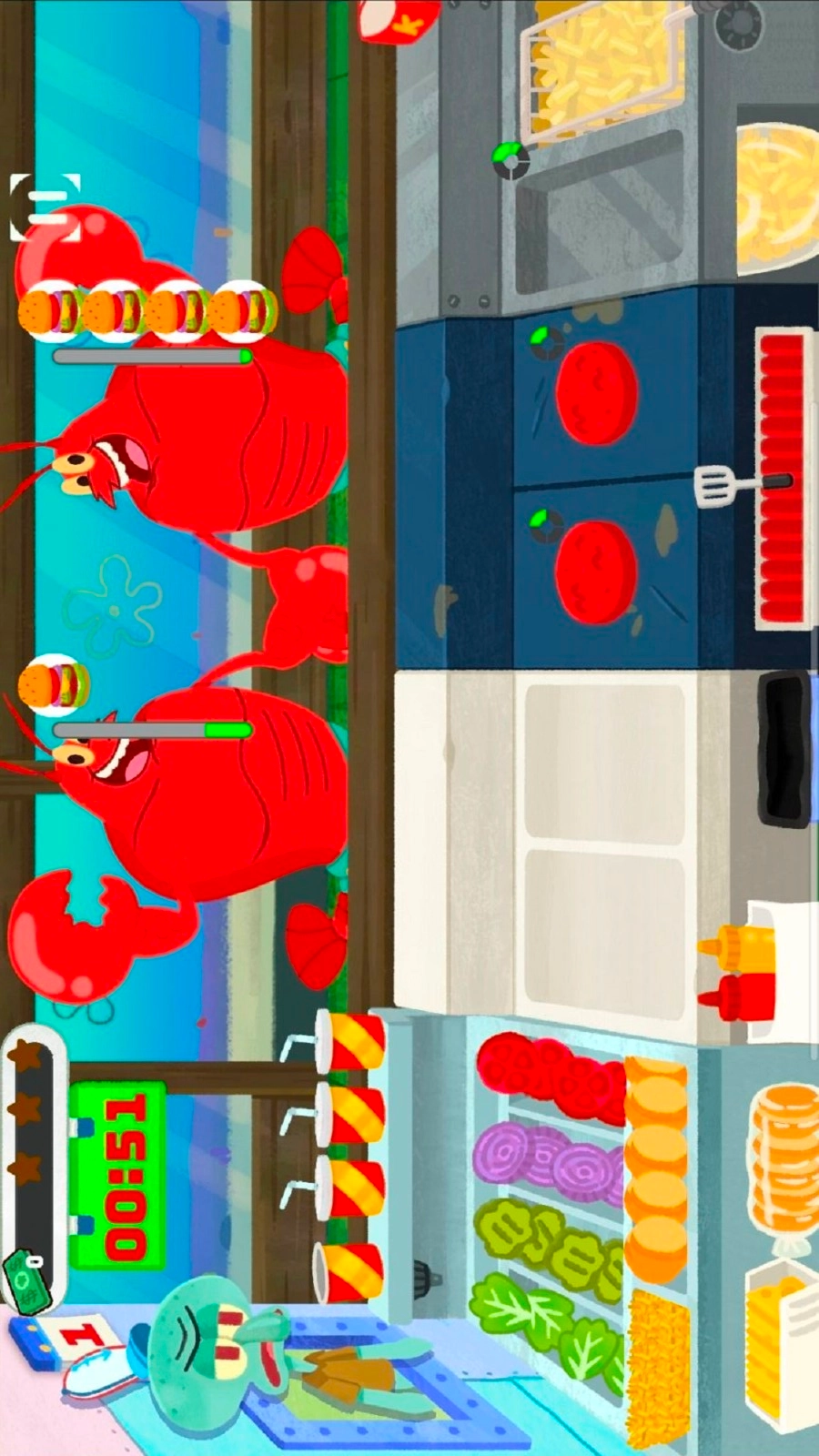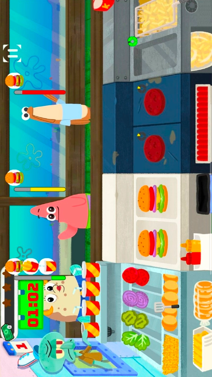 这是一款模拟经营类游戏,你将化身蟹堡王的员工,为了帮蟹老板赚取更多财富而辛勤工作。你需要运用蟹黄堡的独家秘方制作出美味的蟹堡,在限定时间内尽可能多地完成顾客们的订单。