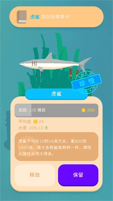 6、看到鱼时点击鱼竿,接着把鱼竿抛向鱼的方向,等看到鱼上钩后点击屏幕就能钓起鱼,你可以选择将鱼释放,释放后鱼会被保留。