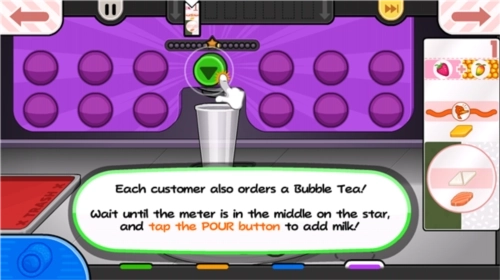 冷饮店:作为较早适配移动端的游戏,它应该是首款以拿起配料均匀喷洒为得分核心的作品。操作仅需左右两个方向,相对容易掌控,也更便于在造型方面取得高分。不过,搅拌机的耗时过长,和其他操作步骤难以很好地配合。 煎饼店:这是我个人不太偏好的一款。得分点涵盖了从高处抛饼以及圆形对称浇汁等环节,并且圆形浇汁采用的是侧面俯视视角,判定机制相当模糊,基本上除了教程关卡外,我就没拿到过高分。