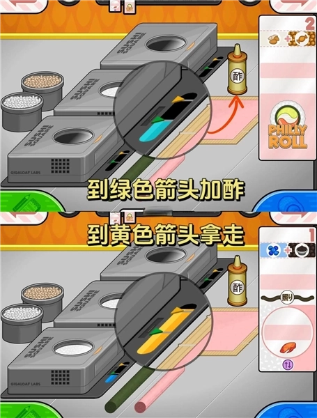 黄色阶段:看到黄色箭头时,要快速添加酢,接着取走黄色箭头位置的寿司。