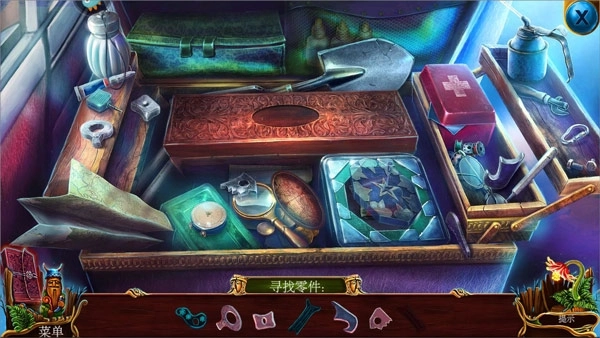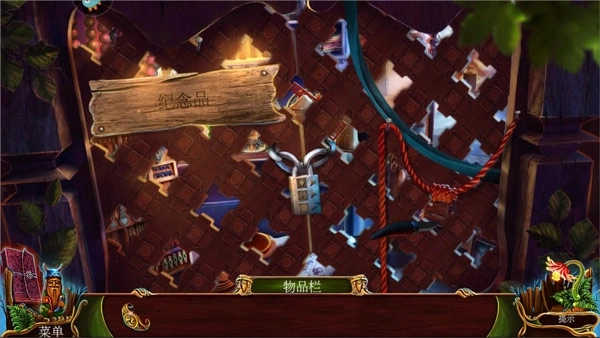 4、紧接着,在船上的雕像的胸口处放入我们之前获得的船桨,拿到了箱子的零件,返回到桥上把箱子嵌入物放入箱子,刀片停下,过桥,点击杂物堆完成寻物游戏拿到尖碎块。