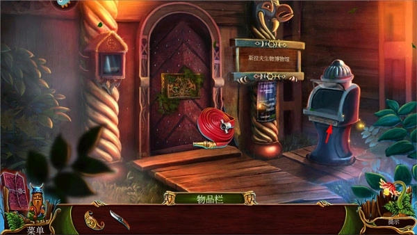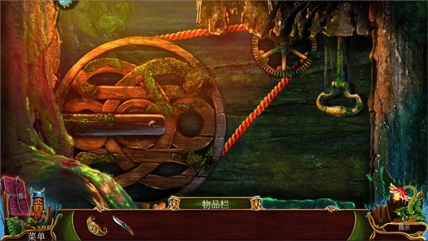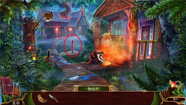 10、然后重现返回到神殿的门口,这次点击最右边(红标)的杂物堆进入寻物游戏,完成游戏后获得木质符文,用小刀片砍掉左边废墟中的树枝(图中红标位置),拿到了狒狒雕像和金属丝。