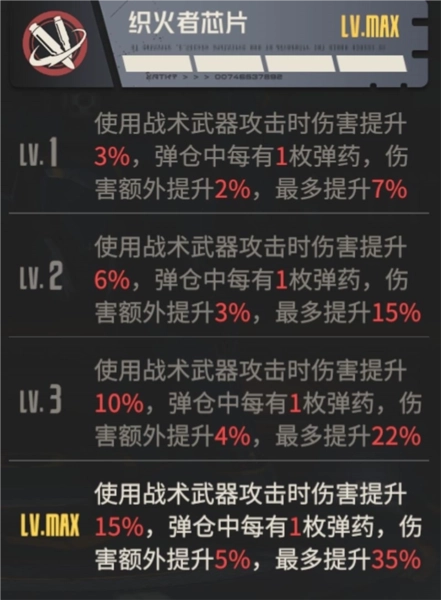 最近实装的两款机兵四级模组,似乎呈现出一个共性趋势:它们开始突破过去30%的增伤上限,将峰值提升至35%,不过这并非稳定的常驻效果,而是附带衰减机制的动态数值。以织火者芯片为例,它针对战术武器的增伤由两部分构成——15%的基础常驻加成,加上弹仓当前弹药数量乘以5%的额外加成,因此实际增伤区间在20%到35%之间浮动:当弹仓剩余4发弹药时,增伤达到最高的35%,后续随着弹药不断消耗,这部分加成也会逐步下降。