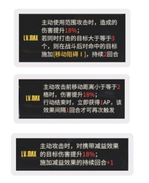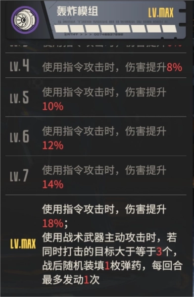 八级模组是轰炸模组,兼具输出能力与功能性,增伤比例为18%,和大部分模组处于同一水平,但它限定了指令攻击的触发条件。LV8的额外效果是每回合有一次机会:当使用战术武器进行攻击时,若攻击目标数量超过3个,就能回复1枚弹药。从效果层面来看,这明显是一个战术机兵模组。而最关键的一点在于,它的触发条件极为宽松——由于战术武器的攻击本身就属于指令攻击,所以几乎全程都能保持生效状态。相比之下,其他几款常用的战术机兵模组多少都存在一定限制,比如马尔萨斯需要达成范围攻击条件,银闪依赖减益效果触发,伊格尼特则要求移动距离小于2。