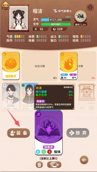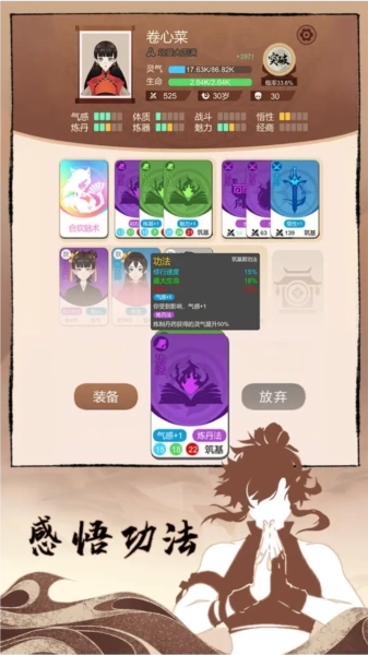 3、查看你现有功法的属性,找到你要更换的功法卡片,点击装备。