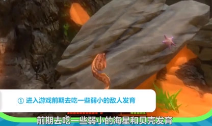 1、挑选一条心仪的鱼开启游戏,前期可以通过捕食一些弱小的海星和贝壳来提升自身发育进度。