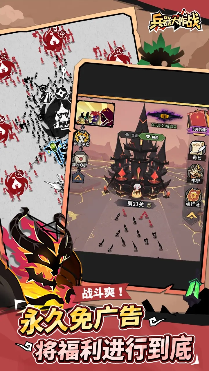 3. 兵器种类丰富不同卡牌具备特色技能,例如冲锋盾兵可嘲讽敌人吸引火力,远程法师可远程输出火球术等。