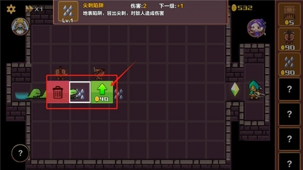 5、接下来我们点击场上的地刺陷阱,左侧同样是删除功能,右侧则为升级功能。