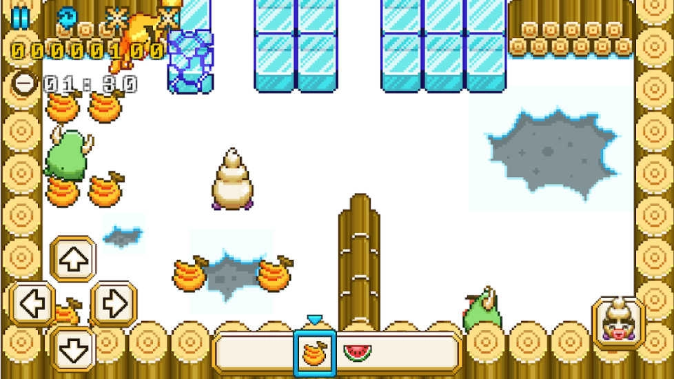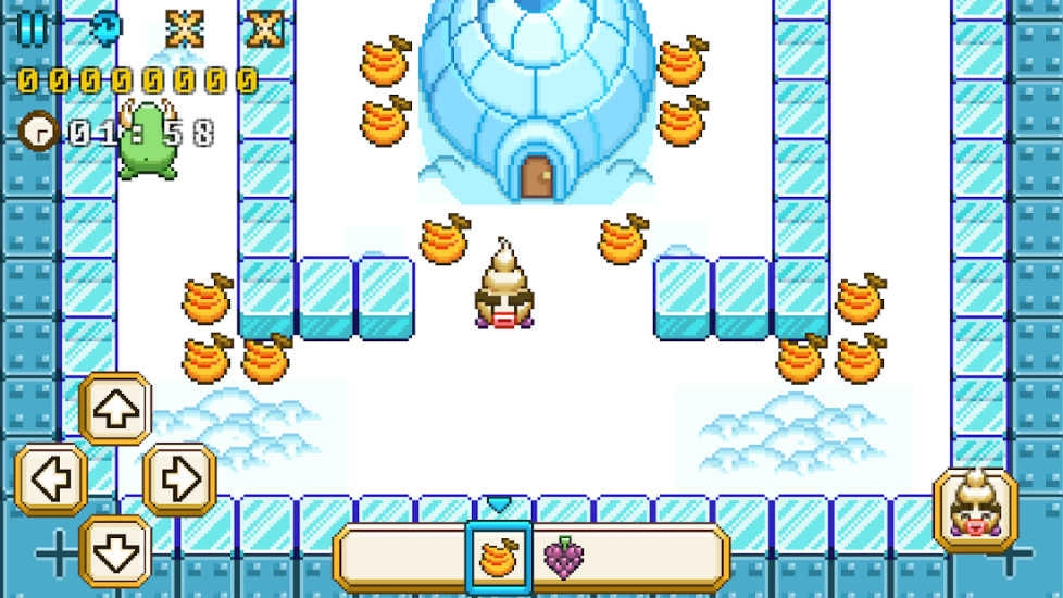像素风勾勒出圆润可爱的反派形象,水果收集系统融入轻策略元素——草莓补血、柠檬加速、菠萝触发短暂冰雾掩护。